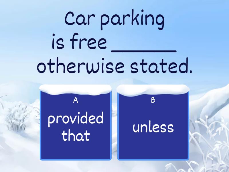 1) Car parking is free ______ otherwise stated. a) provided that b) unless 2) I will go ______________ the others go. a) unless b) provided that 3) All rates are per month __________otherwise noted. a) unless b) as long as 4) Any apartment will do ____________ the rent is reasonable. a) as long as b) unless 5) ___________ you are happy, I am happy. a) Unless b) As long as 6) They may do whatever they like ___________ it is within the law. a) provided that b) unless 7) You aren't allowed to leave _________ you get the doctor's permission. a) as long as b) unless 8) __________ there are enough seats, anyone can come on the trip. a) Provided that b) Unless 9) I don't care what anybody says about me ________ it isn't true. a) unless b) as long as