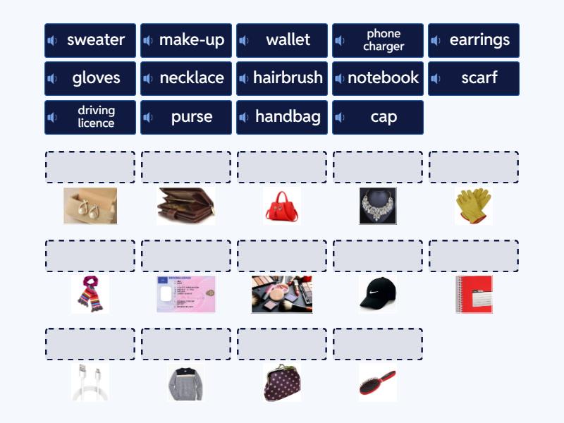 cap, driving licence, earrings, gloves, hairbrush, handbag, make-up, necklace, notebook, phone charger, purse, scarf, sweater, wallet,