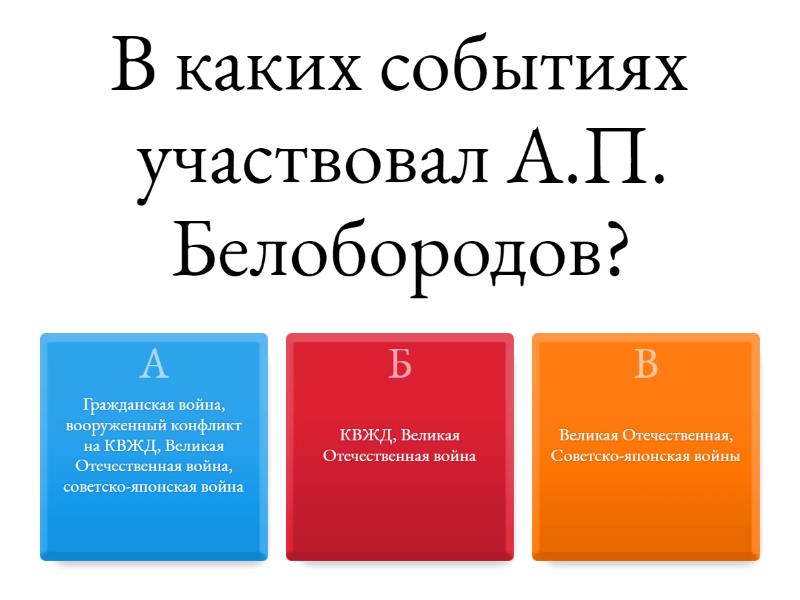 1) В каких событиях участвовал А.П. Белобородов? a) Гражданская война, вооруженный конфликт на КВЖД, Великая Отечественная война, советско-японская война b) КВЖД, Великая Отечественная война c) Великая Отечественная, Советско-японская войны 2) Дважды Герои Советского Союза Иркутской области: a) А.П. Белобородов и Н.В. Челноков b) А.П. Белобородов c) Н.В. Челноков 3) Кто из Героев СССР командовал во время Великой Отечественной войны бомбардировочным и штурмовым авиаполками? a) Н.В. Челноков b) А.П. Белобородов c) В.М. Безбоков 4) В честь некоторых участников Великой Отечественной войны назвали улицы нашего города, сопоставьте улицы и имена этих героев, их подвиги: a) 1- A, 2-B, 3 - D, 4 - C, 5 - E b) 1- В, 2-А, 3 - С, 4 - D, 5 - E c) 1- D, 2-А, 3 - С, 4 - A, 5 - E 5) Этот Генерал- полковник авиации, Герой Советского Союза, получил Звезду Героя в 1945 году за 259 успешных боевых вылетов, он почетный гражданин города Иркутска. Кто это? a) Н.В. Челноков b) В.М. Безбоков c) А.Е. Голованов 6) На каком предприятии Иркутска до отправки на Тихоокеанский флот работала в годы войны Мария Цуканова? a) Иркутский завод тяжелого машиностроения им. В.В. Куйбышева b) Иркутский авиационный завод им. И.В. Сталина c) Иркутское речное пароходство 7) Какое почетное наименование получила Иркутская дивизия за подвиги по освобождению Белоруссии? a) Пинская b) Минская c) Белорусская 8) Каким участникам Великой Отечественной войны, уроженцам Иркутской области установлены бюсты в Иркутске? a) А.П. Белобородову, К.К. Рокоссовскому b) А.П. Белобородову, Н.В. Челнокову, В. Березовской c) Н.А. Вилкову, В.Ф. Жукову 9) На этом месте зарыты капсулы с землей городов – героев СССР, как оно называется? a) мемориальный комплекс «Иркутяне в годы Великой Отечественной войны 1941–1945 годов». b) Сквер имени Кирова c) Мемориал на Амурском кладбище 10) «Баллада о тополях» иркутского поэта Марка Сергеева написана об этом месте, в честь павших Героев. В 1985 году там установили мемориал. Что это за место? Откуда ушли Герои на войну? "А в том году столкнулась сила с силой,Стояла насмерть русская земля…За тысячу верст разбросаны могилы Тех, что сажали эти тополя» a) Возле Банка b) Возле Школы c) Возле Училища 11) Единственная женщина, наша землячка, награжденная Звездой Героя Советского Союза, за подвиг в войне с Японией, кто она? a) Лидия Превалова b) Мария Цуканова c) Надежда Руденко 12) Командиром какой дивизией был А.П. Белобородов с 1941 года? По итогам боев под Москвой она была награждена орденом Красного Знамени и получила звание 9-й гвардейской. a) 78-я стрелковая дивизия b) 98-я танковая дивизия c) 116-я пехотная дивизия 13) Уроженец Иркутской области, удостоенный звания Герой Советского Союза за бои на Халхин-голе, командуя стрелковым батальоном, погиб в сентябре 1941 г. при обороне Киева. a) К. И. Провалов b) И.И. Евсеев c) И.С. Мясников 14) Герой Советского Союза, участник разгрома Квантунской армии в августе 1945 г., командуя 196-м истребительным авиаполком, стал одним из самых результативных летчиков Корейской войны 1950-1953 гг. a) И.Л Баламуткин b) Е. И. Пепеляев c) Н.Д. Пахотищев