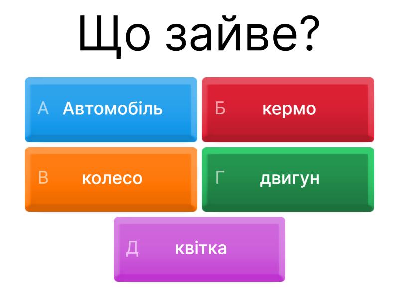 1) Що зайве? a) Автомобіль b) кермо c) колесо d) двигун e) квітка 2) Що зайве? a) Кішка b) собака c) хвіст d) вуса e) яблуко 3) У мене є колеса, кермо та двигун. Я можу їздити по дорозі та перевозити людей. Хто я? a) Автомобіль b) Велосипед 4) Я маленький, пухнастий та люблю пити молоко. Хто я? a) Кошеня b) Курча 5) У мене є крила, але я не птах. Я можу літати високо в небі. Хто я? a) Кажан b) Літак