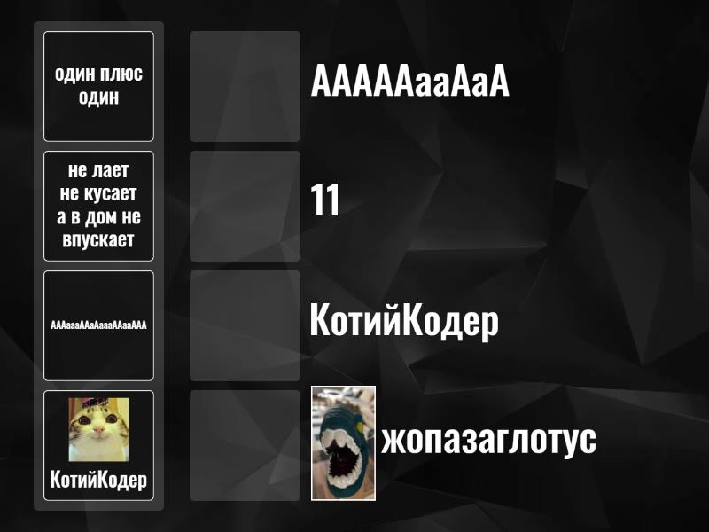 КотийКодер - КотийКодер, не лает не кусает а в дом не впускает - жопазаглотус, один плюс один - 11, АААаааААаАаааААааААА - АААААааАаА,