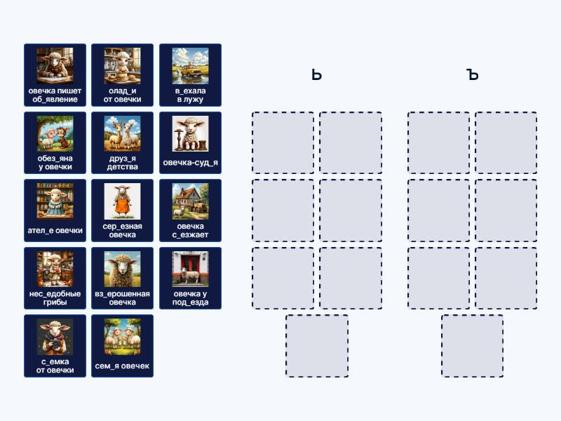 ь: овечка-суд_я, сер_езная овечка, сем_я овечек, обез_яна у овечки, друз_я детства, ател_е овечки, олад_и от овечки, ъ: нес_едобные грибы, овечка пишет об_явление, овечка у под_езда, с_емка от овечки, овечка с_езжает, вз_ерошенная овечка, в_ехала в лужу,
