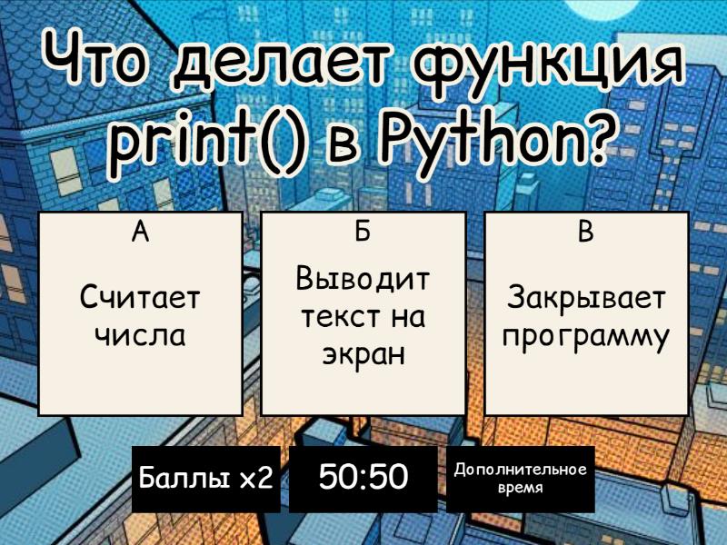 1) Что делает функция print() в Python? a) Считает числа b) Выводит текст на экран c) Закрывает программу 2) Какой оператор используется для сложения чисел в Python? a) + b) - c) * d) / 3) Как объявить переменную name со значением "Иван"? a) name = "Иван" b) let name = "Иван" c) var name = "Иван" d) Иван 4) Какой тип данных используется для хранения текста? a) float b) bool c) str d) int 5) Какой тип данных используется для хранения целых чисел? a) str b) int c) float d) bool 6) Как вывести на экран Hello, world!? a) echo "Hello, world!" b) print("Hello, world!") c) write("Hello, world!") d) print(Hello, world!) 7) Что делает input()? a) Выводит текст на экран b) Закрывает программу c) Запрашивает ввод у пользователя d) Ничего 8) Какой оператор используется для сравнения равенства? a) == b) = c) != d) += 9) Что делает if в Python? a) Повторяет код b) Проверяет условие c) Завершает программу d) Выводит текст на экран 10) Как записать условие "если x больше 10"? a) if x > 10: b) if x => 10: c) if (x > 10) d) if x < 10: 11) Каким оператором заканчивается if? a) : b) ; c) . d) = 12) Какой цикл выполняется, пока условие истинно? a) for b) while c) do-while d) if 13) Что делает for i in range(5):? a) Повторяет код 5 раз b) Запускает бесконечный цикл c) Вызывает ошибку d) Ничего 14) Как выйти из цикла раньше? a) exit b) break c) stop d) // 15) Что делает continue? a) Прерывает цикл b) Запускает новый цикл c) Пропускает итерацию и продолжает d) Вызывает ошибку 16) Какой цикл удобнее для перебора элементов списка? a) for b) while c) if d) next 17) Как узнать длину списка my_list? a) length(my_list) b) len(my_list) c) my_list.len() d) lens() 18) Какой оператор используется для возведения числа в степень? a) ^ b) * c) ** d) % 19) Какой оператор используется для проверки неравенства? a) = b) == c) != d) !== 20) Какой метод используется для преобразования строки в нижний регистр? a) lower() b) upper() c) capitalize() d) title() 21) Какой оператор используется для выполнения блока кода, если условие ложно? a) if b) else c) elif d) switch 22) Какой метод используется для преобразования строки в верхний регистр? a) lower() b) upper() c) capitalize() d) title() 23) Какой оператор используется для выполнения блока кода определенной количество раз? a) for b) while c) do-while d) loop 24) Какой метод используется для нахождения минимального значения в списке? a) max() b) min() c) sum() d) avg() 25) Какой оператор используется для выполнения блока кода, если оба условия истинны?  a) and b) or c) not d) xor