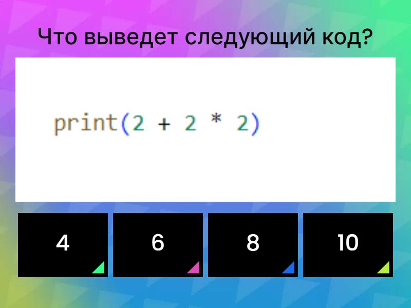 1) Что выведет следующий код? a) 4 b) 6 c) 8 d) 10 2) Какие числа будут выведены? a) 14, 15, 16, 17, 18, 19 b) 14, 15, 16, 17, 18 c) 15, 16, 17, 18, 19 d) 15, 16, 17, 18 3) Какой оператор используется для присваивания значения переменной? a) == b) = c) != d) <> 4) Что делает функция choice() из модуля random? a) Сортирует список в случайном порядке b) Возвращает случайное целое число в заданном диапазоне. c) Выбирает случайный элемент из списка d) Создает случайный список. 5) Какой цикл используется для повторения блока кода несколько раз? a) if b) else c) for d) print 6) Какая функция используется для получения ввода от пользователя? a) print() b) def() c) input() d) return() 7) Разгадай ребус a) ! b) ? 8) Что выведет следующий код? a) 1 b) 2 c) 3 d) Ошибка 9) Что делает следующий код? a) Выводит числа от 1 до 10 b) Выводит числа от 2 до 20, кратные двум c) Выводит числа от 1 до 11 d) Выдает ошибку. 10) Разгадай ребус a) ! b) ?