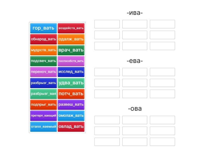 -ива-: развеш_вать, одалж_вать, разбрызг_вать, подпрыг_вать, подсвеч_вать, омолаж_вать, отапл_ваемый, разбрызг_вая, удва_вать, -ева-: переноч_вать, потч_вать, врач_вать, гор_вать, овлад_вать, претерп_вающий, -ова: воздейств_вать, мудрств_вать, исслед_вать, обнарод_вать, поспособств_вать,