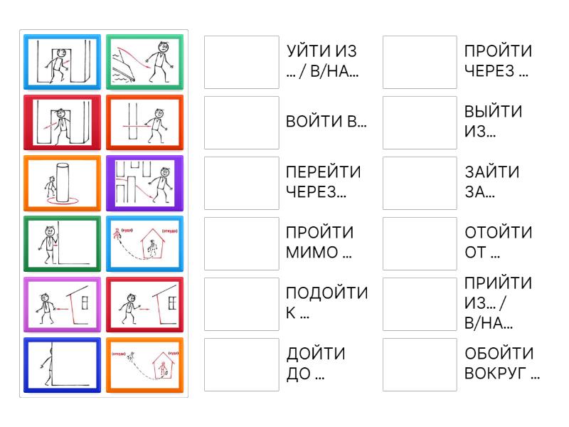 ВОЙТИ В... , ВЫЙТИ ИЗ..., ДОЙТИ ДО ..., ЗАЙТИ ЗА..., ОБОЙТИ ВОКРУГ ..., ОТОЙТИ ОТ ..., ПЕРЕЙТИ ЧЕРЕЗ..., ПОДОЙТИ К ..., ПРИЙТИ ИЗ... / В/НА..., ПРОЙТИ МИМО ..., ПРОЙТИ ЧЕРЕЗ ..., УЙТИ ИЗ ... / В/НА...,