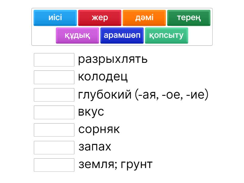 жер - земля; грунт, қопсыту - разрыхлять, арамшөп - сорняк, иісі - запах, дәмі - вкус, терең - глубокий (-ая, -ое, -ие), құдық - колодец,
