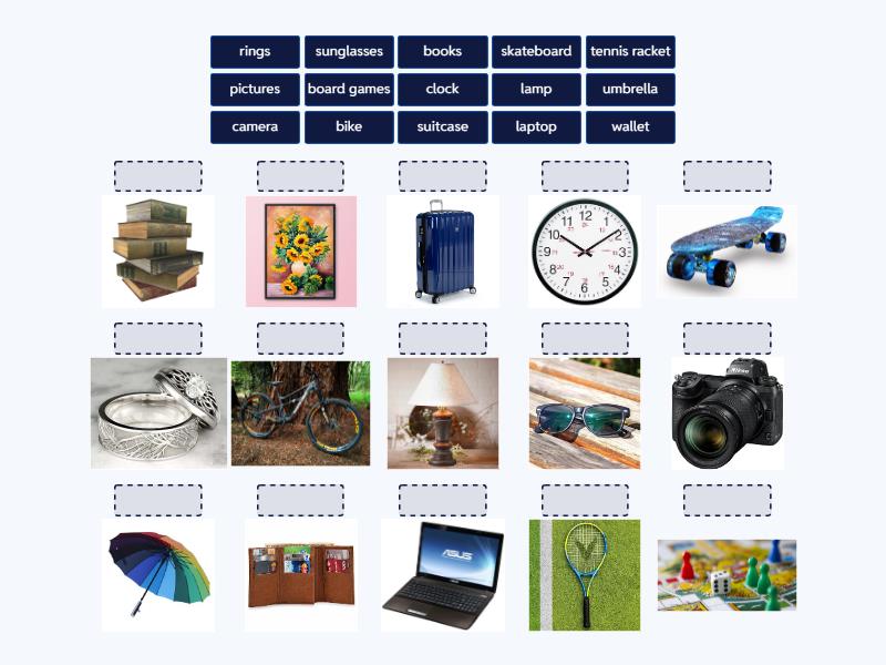 wallet, board games, skateboard, books, sunglasses, umbrella, laptop, camera, lamp, tennis racket, clock, suitcase, bike, rings, pictures,