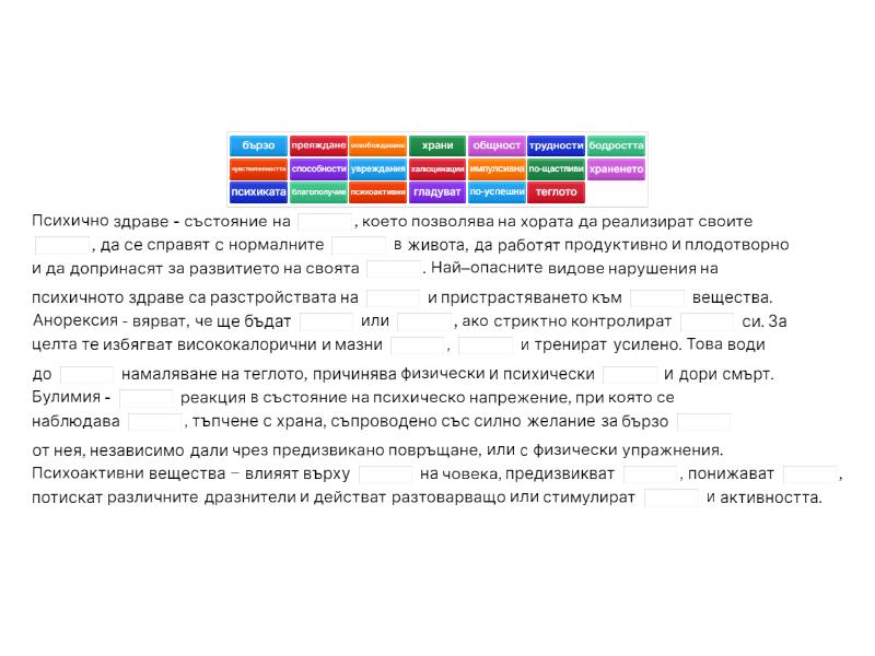 Психично здраве - състояние на ____, което позволява на хората да реализират своите ____, да се справят с нормалните ____ в живота, да работят продуктивно и плодотворно и да допринасят за развитието на своята ____. Най–опасните видове нарушения на психичното здраве са разстройствата на ____ и пристрастяването към ____ вещества. Анорексия - вярват, че ще бъдат ____ или ____, ако стриктно контролират ____ си. За целта те избягват висококалорични и мазни ____, ____ и тренират усилено. Това води до ____ намаляване на теглото, причинява физически и психически ____ и дори смърт. Булимия - ____ реакция в състояние на психическо напрежение, при която се наблюдава ____, тъпчене с храна, съпроводено със силно желание за бързо ____ от нея, независимо дали чрез предизвикано повръщане, или с физически упражнения. Психоактивни вещества – влияят върху ____ на човека, предизвикват ____, понижават ____, потискат различните дразнители и действат разтоварващо или стимулират ____ и активността.