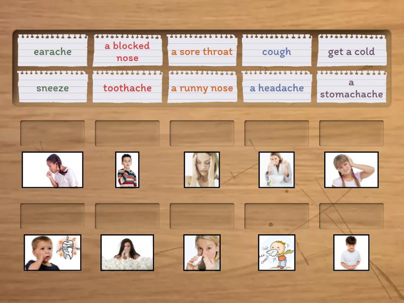get a cold, sneeze, cough, a blocked nose, a runny nose, a sore throat, earache, a headache, a stomachache, toothache,