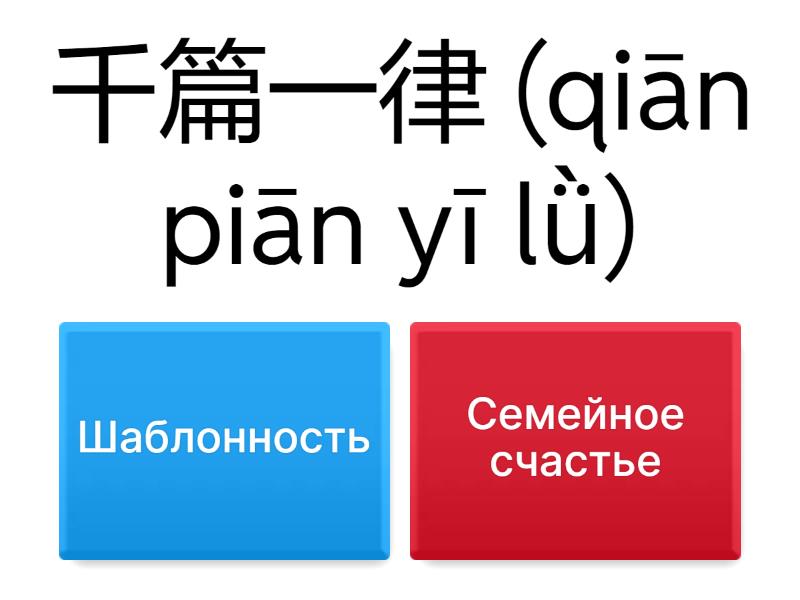 1) 千篇一律 (qiān piān yī lǜ) a) Шаблонность b) Семейное счастье 2) 一成不变 (yī chéng bù biàn) a) Без изменений b) Праздничное настроение 3) 平白无故 (píng bái wú gù) a) Без причины b) Обилие талантов 4) 杞人忧天 (Qǐ rén yōu tiān) a) Напрасные тревоги b) Чем больше, тем лучше 5) 天伦之乐 (tiān lún zhī lè) a) Семейное счастье b) Застыть в неизменности 6) 喜气洋洋 (xǐ qì yáng yáng) a) Радостное настроение b) Боязнь опасности 7) 后顾之忧 (hòu gù zhī yōu) a) Угроза с тыла b) Искренние чувства 8) 情真意切 (qíng zhēn yì qiè) a) Искренние чувства b) Простая еда 9) 家常便饭 (jiā cháng biàn fàn) a) Обычное дело b) Беспокоиться попусту 10) 家喻户晓 (jiā yù hù xiǎo) a) Общеизвестный b) Золото и нефрит 11) 金玉满堂 (jīn yù mǎn táng) a) Несметные богатства b) Спускаться до уровня 12) 多多益善 (duō duō yì shàn) a) Чем больше, тем лучше b) Талант иссяк 13) 江郎才尽 (Jiāng láng cái jìn) a) Талант иссяк b) Чем больше, тем лучше 14) 一般见识 (yì bān jiàn shí) a) Спускаться до уровня b) Богатство знаний 15) 欲盖弥彰 (yù gài mí zhāng) a) Скрыть усугубляет b) Семейное счастье 16) 千篇一律 (qiān piān yī lǜ) a) Шаблонность b) Радостное настроение 17) 一成不变 (yī chéng bù biàn) a) Без изменений b) Напрасные тревоги 18) 平白无故 (píng bái wú gù) a) Без причины b) Чем больше, тем лучше 19) 杞人忧天 (Qǐ rén yōu tiān) a) Напрасные тревоги b) Застыть в неизменности 20) 天伦之乐 (tiān lún zhī lè) a) Семейное счастье b) Шаблонность