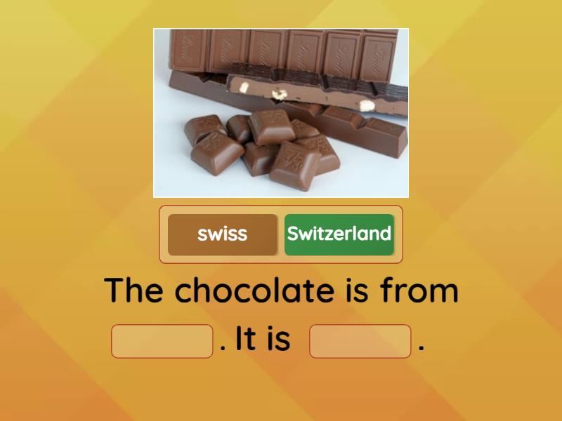 She is from ____. She is ____. He is from ____. He is ____. They are from ____. They are ____. The chocolate is from ____. It is ____. She is from ____. She is ____. They are from ____. They are ____. She is from ____. She is ____. They are from ____. They are ____. I am from ____. I'm ____.