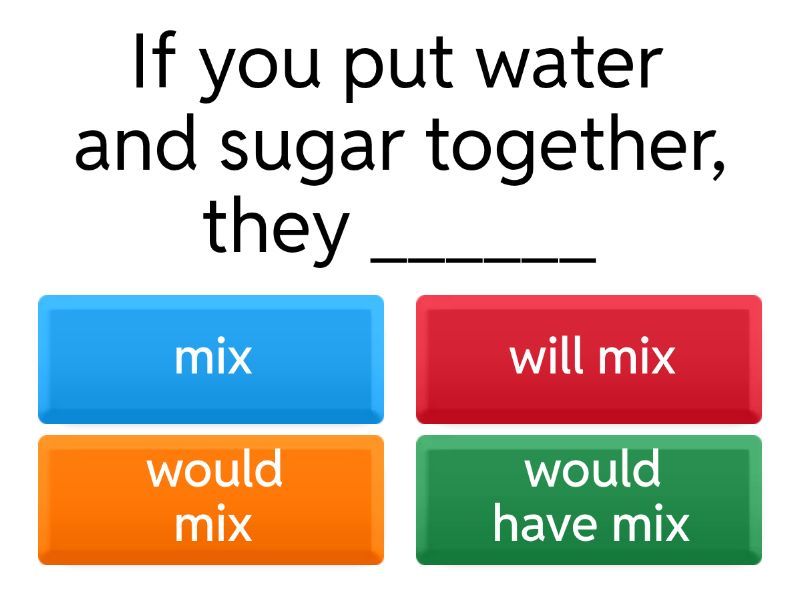 1) If you put water and sugar together, they ______ a) mix b) will mix c) would mix d) would have mix 2) If you heat ice, it _____ a) melts b) will melt c) would melt d) would have melt 3) If you heat water to 100 degrees Celsius, it _______ a) boils b) will boil c) would boil d) would have boiled 4) If you combine oil and water, they _______. a) do not mix b) won't mix c) wouldn't mix d) wouldn't have mixed 5) If you breathe in helium, your voice _________ a) changes b) will change c) would change d) would have changed 6) If you do not keep the ice cream in the freezer, it ______. a) melts b) will melt c) would melt d) would have melted 7) If you add salt to the water, the salt _________. a) dissolves b) will dissolve c) would dissolve d) would have dissolved 8) If you do not put milk in the freezer, it ______. a) goes off b) will go off c) would go off d) would have gone off 9) If you eat junk food, you _____ fat. a) get b) won't get c) would get d) would have got 10) If you drink coffee before bed, you ______. a) don't sleep b) won't sleep c) wouldn't sleep d) wouldn't have slept 11) If I________free on Saturday, I'll help you with the painting a) am b) will be c) would be d) would have been 12) If you _______ (not/slow down), you will have an accident a) don't slow down b) won't slow down c) wouldn't slow down d) wouldn't have slowed down 13) If I fail my exams, I _______ (be) very unhappy a) will be b) am c) would be d) would have been 14) We can go for a drink if I _____ (finish) my work on time a) finish b) will finish c) would finish d) would have finished 15) If it snows tomorrow, I _____ (wear) a hat. a) wear b) will wear c) would wear d) would have worn 16) If I________free on Saturday, I'll help you with the painting a) am b) will be c) would be d) would have been 17) If you _______ (speak) English every day, you will learn quicker. a) speak b) will speak c) would speak d) would have spoken 18) Your dinner _______ (not/get) cold if you eat it now. a) don't get b) won't get c) wouldn't get d) wouldn't have got 19) I’ll be on vacation if you _______ (visit) me next week. a) visit b) will visit c) would visit d) would have visited 20) If you go outside without a sweater, you _____ (get) sick. a) get b) will get c) would get d) would have got 21) If I had studied harder, I _________ the exam. a) pass b) will pass c) would pass d) would have passed 22) If she _______ earlier, she wouldn’t have missed the train a) leave b) will leave c) would leave d) had left 23) If we had saved more money, we __________ abroad last summer. a) travel b) will travel c) would travel d) would have traveled 24) If he_________ to me, he wouldn’t have made that mistake. a) listen b) will listen c) would listen d) had listened 25) If you _______ me, I would have helped you immediately. a) call b) will call c) would call d) had called 26) If I __________you, I'd put the desk by the window. a) are b) will be c) were d) had been 27) I ______________ all my friends to live with me if I lived in a big house! a) bring b) will bring c) would bring d) had brought 28) How ________________if you lived on the thirtieth floor? a) feel b) will feel c) would you feel d) had felt 29) If I _______________ that shirt, my mum would buy it for me. a) wanted b) will want c) would want d) had wanted 30) If I were a disney character, I _________ Aladin a) am b) will be c) would be d) had been