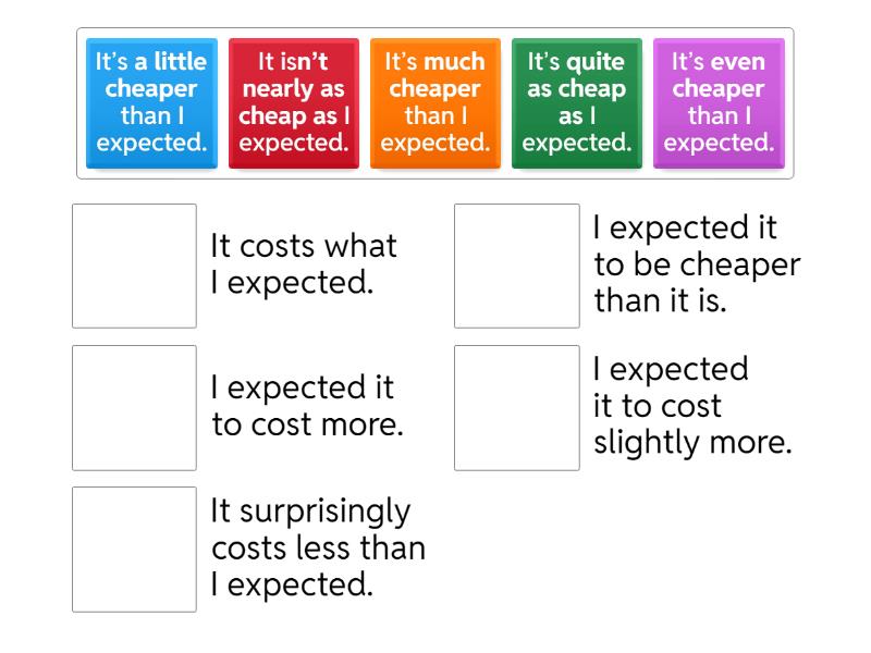It’s much cheaper than I expected. - I expected it to cost more., It’s a little cheaper than I expected. - I expected it to cost slightly more., It isn’t nearly as cheap as I expected. - I expected it to be cheaper than it is., It’s quite as cheap as I expected. - It costs what I expected., It’s even cheaper than I expected. - It surprisingly costs less than I expected.,