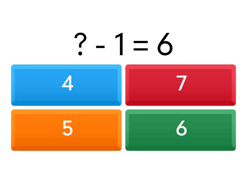1) ? - 1 = 6 a) 4 b) 7 c) 5 d) 6 2) ? - 5 = 3 a) 5 b) 2 c) 3 d) 8 3) ? - 1 = 9 a) 1 b) 10 c) 9 d) 8 4) ? - 5 = 0 a) 0 b) 4 c) 6 d) 5 5) ? - 4 = 2 a) 10 b) 14 c) 4 d) 6 6) ? - 2 = 8 a) 10 b) 2 c) 18 d) 8 7) ? - 3 = 7 a) 3 b) 10 c) 13 d) 7