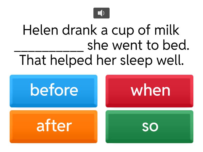 1) Helen drank a cup of milk __________ she went to bed. That helped her sleep well. a) before b) when c) after d) so 2) __________ Jack left the classroom, he forgot his schoolbag. a) Because b) Through c) When d) After 3) __________ you finish your homework, please mop the floor for me. a) When b) Because c) After d) So 4) Ted took a walk yesterday __________ it was dark. a) When b) Because c) After d) Before 5) __________ ball is it? B: It's Hank's. a) Who b) What c) Whose d) Where 6) These are not our chairs. They are __________. a) the girls b) the girls' c) them d) their 7) A: Could you send this box of fruit __________ Ms. Dall __________ me? B: Sure. a) for; X b) to; to c) to; for d) for: for 8) A: Look. Mira and her sisters are sitting over there. Who's that cute guy next to them? B: That's a relative (親戚) of __________. a) they b) them c) Mira's sisters d) theirs 9) Mr. and Mrs. Lopez named (命名) their daughter Amor. It __________ "love." a) means b) sends c) gives d) orders 10) I was late for work because we had __________ snow this morning. a) mad b) kind c) heavy d) fun 11) A: What are you doing? B: I'm making a bag __________ my mom __________ her birthday. a) to; for b) to; to c) for; for d) for; to 12) A: Did Ann lend you her notes (筆記)? B: Yes, she did. That was very kind __________ her. a) at b) of c) on d) for 13) A: __________ the weather in Taipei yesterday? B: It was sunny. a) How is b) What is c) How was d) What was 14) My aunt bought __________ a snowboard last week. a) I b) it c) my d) me 15) A: __________ is so hot today! Let's go have some ice cream. B: Sure. a) It b) This c) That d) There 16) A: Who gave __________ you the watch? B: My uncle did. a) to b) X c) with d) for 17) Please send Jacob __________. a) it b) them c) book d) the books 18) A: __________ was the weather like in New York last Friday? B: It was __________. a) How; sun b) What; sun c) How; sunny d) What; sunny 19) A: __________ rain very often in this place? B: Yes, it's very rainy here. a) Is there b) Are there c) Does it d) Do they 20) A: How was your trip to Kenya? B: ___________________. a) People in Kenya are nice. b) It was cold in winter in Kenya. c) It was fun. I had a great time. d) It was cold and snowy in Kenya. 21) It's 6:40. Let's go now. The movie __________ at 7 p.m. a) ends b) teaches c) starts d) hears 22) The woman __________ her kids an interesting story. a) called b) told c) started d) finished 23) I couldn't reach (連繫上) Kyle yesterday because I had the __________ number. a) same b) wrong c) free d) own 24) The science lessons are free. You can go to Mr. Taylor and __________ for them. a) sign up b) hold on c) check out d) make up 25) The big house is __________, and the small one is theirs. a) my b) mine c) them d) their 26) I saw a dog of __________ in the park this morning. a) your b) yours c) them d) their 27) Emma always listens to music when she __________. a) studied b) study c) studying d) studies 28) Sean studied at 7:30 and swam at 9:00. Sean swam __________. Sean swam __________ he studied. a) because b) when c) before d) after 29) When Sam has free time, he __________ basketball. a) playing b) plays c) played d) is playing 30) A: Did you hear __________ Penny's story? B: Yes. She is poor but happy. a) about b) for c) from d) with 31) __________ me when you finish your homework. a) Calling b) Called c) Be calling d) Call 32) A: Hello, this is Cody. May I speak to Meg? B: ____________________. A: Can you buy a birthday cake for me? I am too busy today. a) She's not in. b) Who's calling? c) Sorry about that. d) Speaking. What's up?