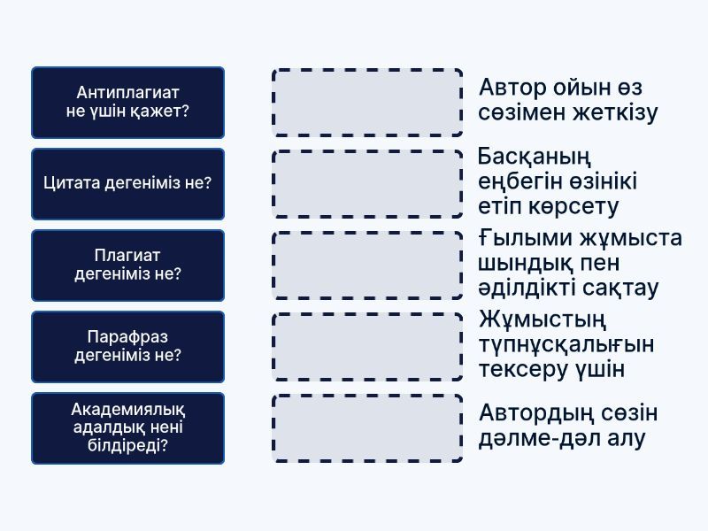 Плагиат дегеніміз не? - Басқаның еңбегін өзінікі етіп көрсету, Академиялық адалдық нені білдіреді? - Ғылыми жұмыста шындық пен әділдікті сақтау, Цитата дегеніміз не? - Автордың сөзін дәлме-дәл алу, Парафраз дегеніміз не? - Автор ойын өз сөзімен жеткізу, Антиплагиат не үшін қажет? - Жұмыстың түпнұсқалығын тексеру үшін,