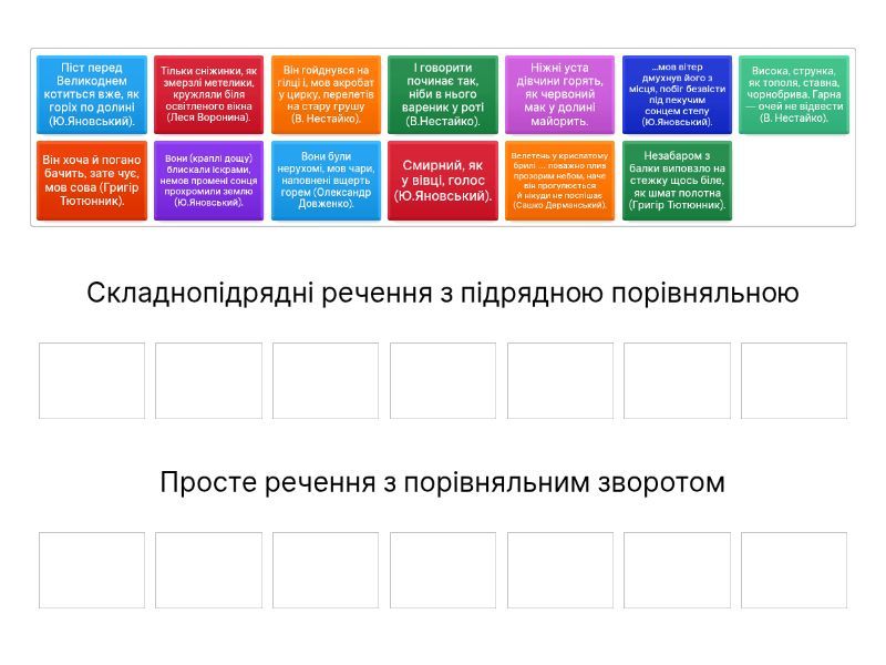 Складнопідрядні речення з підрядною порівняльною: І говорити починає так, ніби в нього вареник у роті (В.Нестайко)., Ніжні уста дівчини горять, як червоний мак у долині майорить., Піст перед Великоднем котиться вже, як горіх по долині (Ю.Яновський)., ...мов вітер дмухнув його з місця, побіг безвісти під пекучим сонцем степу (Ю.Яновський)., Вони (краплі дощу) блискали іскрами, немов промені сонця прохромили землю (Ю.Яновський)., Велетень у крислатому брилі … поважно плив прозорим небом, наче він прогулюється й нікуди не поспішає (Сашко Дерманський)., Просте речення з порівняльним зворотом: Тільки сніжинки, як змерзлі метелики, кружляли біля освітленого вікна (Леся Воронина)., Він гойднувся на гілці і, мов акробат у цирку, перелетів на стару грушу (В. Нестайко)., Висока, струнка, як тополя, ставна, чорнобрива. Гарна — очей не відвести (В. Нестайко)., Смирний, як у вівці, голос (Ю.Яновський)., Незабаром з балки виповзло на стежку щось біле, як шмат полотна (Григір Тютюнник)., Він хоча й погано бачить, зате чує, мов сова (Григір Тютюнник)., Вони були нерухомі, мов чари, наповнені вщерть горем (Олександр Довженко).,