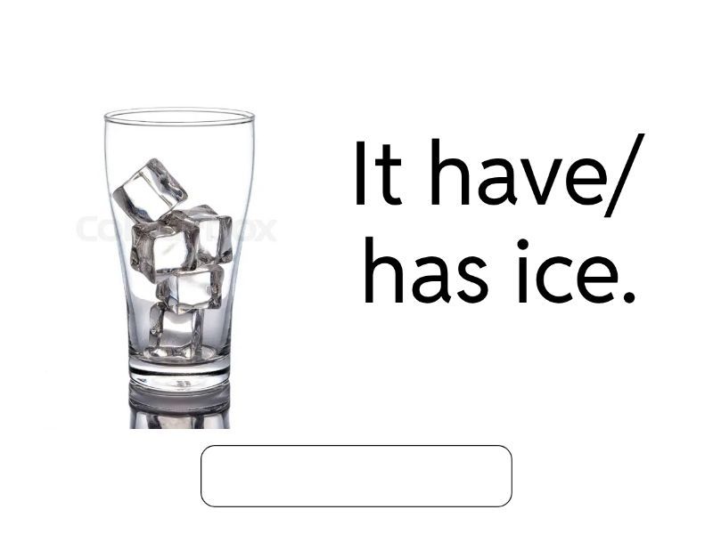 I have / I has a doll., She have/has a ball., He have/has a ball., We have/has a dog., They have/has a cat., Ofri have/has a bat., It have/ has ice..