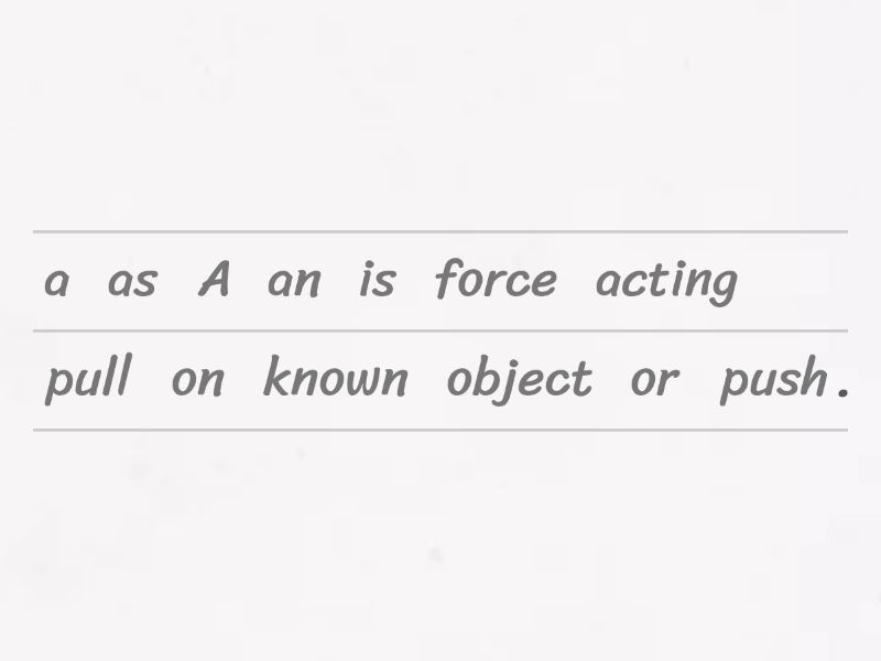 A push or a pull acting on an object is known as force., We cannot see force , but we can feel it., We apply these forces to perform different actions., The amount of force required to do different actions is different.,