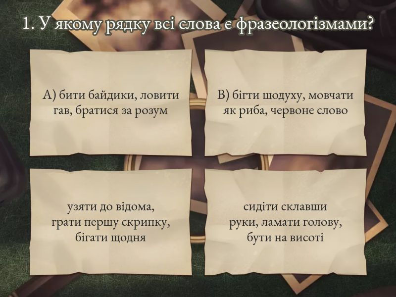 1) 1. У якому рядку всі слова є фразеологізмами? a) A) бити байдики, ловити гав, братися за розум b) B) бігти щодуху, мовчати як риба, червоне слово c) узяти до відома, грати першу скрипку, бігати щодня d) сидіти склавши руки, ламати голову, бути на висоті 2) У якому реченні є відокремлений дієприкметниковий зворот? a) Учні, готуючись до ЗНО, повторювали правила. b) Учні готувалися до ЗНО і повторювали правила. c) Готуючись до ЗНО, учні повторювали правила. d) Учні готуючись до ЗНО повторювали правила. 3) У якому рядку всі слова є спільнокореневими? a) ліс, лісовий, лисиця b) гора, гірський, перегірок c) вода, водяний, підводний d) день, денний, денця 4) Яке речення є складнопідрядним із з’ясувальним підрядним? a) Я знаю, що ти зробиш усе можливе. b) Хто працює, той і має. c) Коли сонце зійде, ми вирушимо в путь. d) Я піду туди, де море шумить. 5) У якому слові відбулося чергування приголосних [г] → [ж]? a) нога — ніжка b) книга — книжка c) дорого — дорожчий d) вухо — вушка 6) У якому реченні допущено граматичну помилку (порушено узгодження)? a) Кожен із учнів написав твір. b) Більшість студентів прийшли вчасно. c) Хто з вас читали цей роман? d) Дехто з гостей залишився довше. 7) Яке слово є прислівником способу дії? a) раптом b) повільно c) сьогодні d) далеко 8) У якому рядку правильно подано наголос? a) фОрзац, дОговір, руслО b) форзАц, договІр, рУсло c) фОрзац, договІр, рУсло d) форзАц, дОговір, руслО 9) Визначте, у якому реченні вжито вставне слово. a) Мабуть, завтра піде сніг. b) Я, мабуть, завтра піду до школи. c) Мабуть завтра піде сніг. d) Завтра мабуть піде сніг. 10) Укажіть рядок, де всі слова — іменники середнього роду. a) море, сонце, життя b) поле, ніч, серце c) небо, калина, каміння d) слово, лис, дерево