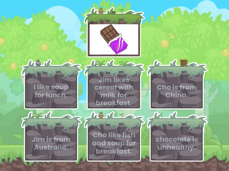 chocolate is unhealthy., Jim likes cereal with milk for breakfast., Cho is from China., Cho like fish and soup for breakfast., I like soup for lunch., Jim is from Australia.,