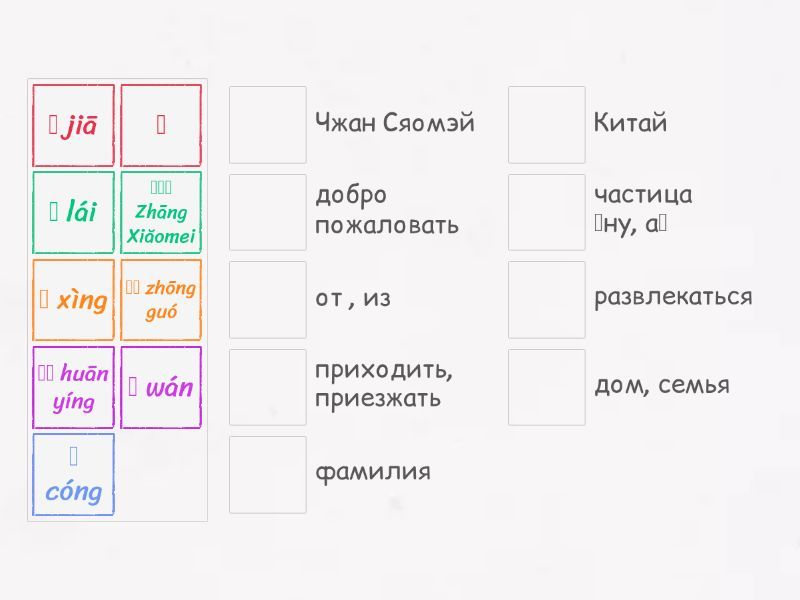 从 cóng - от , из, 来 lái - приходить, приезжать, 姓 xìng - фамилия, 呢 - частица (ну, а), 欢迎 huān yíng - добро пожаловать, 家 jiā - дом, семья, 玩 wán - развлекаться, 中国 zhōng guó - Китай, 张⼩美 Zhāng Xiăomei - Чжан Сяомэй,