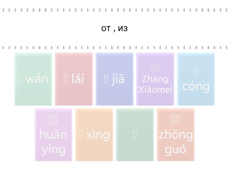 从 cóng - от , из, 来 lái - приходить, приезжать, 姓 xìng - фамилия, 呢 - частица (ну, а), 欢迎 huān yíng - добро пожаловать, 家 jiā - дом, семья, 玩 wán - развлекаться, 中国 zhōng guó - Китай, 张⼩美 Zhāng Xiăomei - Чжан Сяомэй,