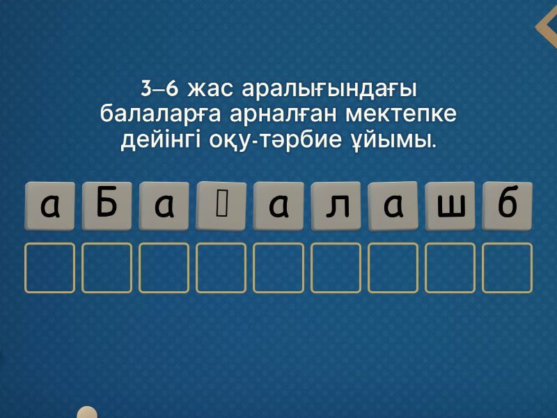 Балабақша - 3–6 жас аралығындағы балаларға арналған мектепке дейінгі оқу-тәрбие ұйымы., Мектеп - Оқушылардың денсаулығын сақтау мен оқу процесі гигиеналық талаптарға сай жүргізілетін мекеме., Гигиена - Денсаулықты сақтау үшін, тазалықты қадағалауды түсіндіретін ғылым., Санитар - Балабақша мен мектептің санитарлық жағдайын тексеретін маман., Эргономика - Денсаулыққа зиян келтірмей, ыңғайлы жұмыс ортасын құруды мақсат ететін бағыт., Парта - Баланың бойына қарай таңдалатын мектеп жиһазы., Дезинфекция - Ойыншықтарды, жиһаздарды тазарту үшін қолданылатын әдіс,