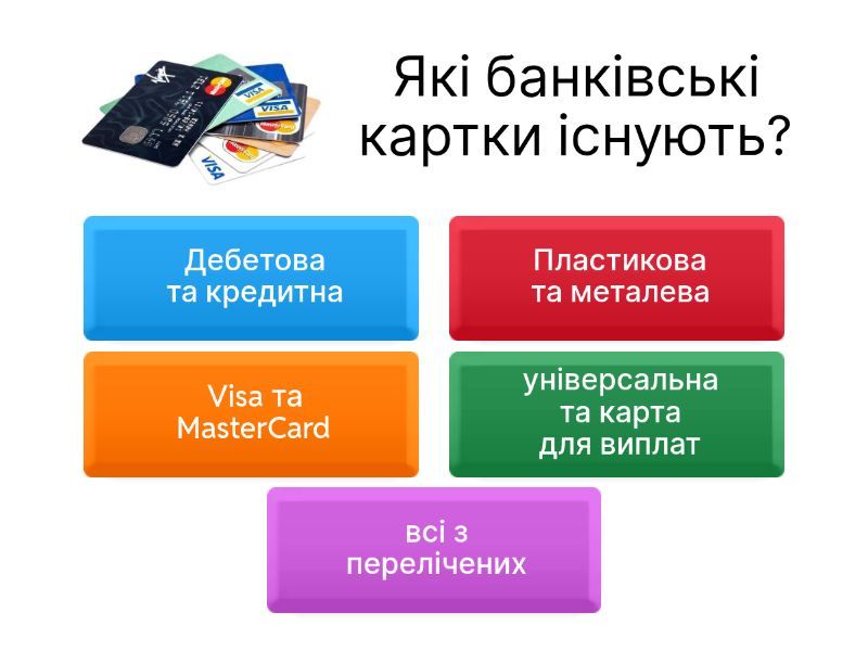 1) Які банківські картки існують? a) Дебетова та кредитна b) Пластикова та металева c) Visa та MasterCard d) універсальна та карта для виплат e) всі з перелічених 2) Оберіть кешбек-сервіс a) App Store b) LetyShops c) Wordwall d) Cashback Unex 3) Оберіть суму максимального місячного кешбеку у програмі "Національний кешбек України" a) 1000 гривень b) 2000 гривень c) 3000 гривень d) кількість не обмежена 4) Що таке бюджет? a) Це план, що відображає доходи та витрати певного суб'єкта (держави, міста, родини чи особи) b) Кошти, які надходять на рахунки держави c) Фінансова основа підприємства d) Грошове вираження податків 5) Які відсоткові ставки Національного кешбеку? a) 15% b) 30% c) 5% d) 10% e) за купівлю товару українського виробника нараховують різні відсотки національногокешбеку f) в залежності від кешбек-сервісу 6) Які гривневі купюри найбільш підробляють шахраї? a) 50 та 100 грн старого зразка b) 100 та 200 гривень старого зразка c) 200 та 500 гривень старого зразка d) 500 та 1000 гривень 7) Що таке НБУ? a) Національне бюро українознавства b) Національній банк України c) Навчальний бібліотечний університет d) Національне бюро успіху 8) Що НЕ можна сплатити з картки національного кешбеку? a) комунальні платежі b) мобільний зв'язок c) продукти українського виробництва d) книжки 9) Що таке "фінансова подушка" a) Кредит, який банк дає кожному на відпочинок b) Таблиця витрат і доходів у зошиті з економіки c) Бонус, який видають після закінчення фінансового курсу d) М’яка подушка, під яку кладуть гроші, щоб вони «не втекли» e) Грошовий резерв, який створюють “на чорний день”, щоб мати фінансову безпеку у разі непередбачених ситуацій 10) Що таке ПДВ? a) Плата за доставку виробів — стягується з кожної покупки b) Пільговий депозит від держави — бонус за відкриття рахунку c) Податок для відпустки — спеціальний збір для туристів d) Податок на додану вартість — непрямий податок, який сплачується при купівлі товарів і послуг 11) Скільки кожен працюючий в Україні сплачує до державного бюджету із своєї заробітної плати у вигляді податків a) 10% — стандартна ставка для всіх працюючих b) 23% — (18% податок на доходи фізичних осіб + 5% військовий збір) c) 15% — лише податок на доходи фізичних осіб d) 19,5% — (18% податок на доходи фізичних осіб + 1,5% військовий збір) 12) На які товари в Україні встановлюється акцизний податок? a) на одяг і взуття b) на електротовари c) на товари зарубіжного виробника d) на авто e) на ліки f) на товари, що шкодять здоров’ю або навколишньому середовищу (алкоголь, тютюн, пальне)