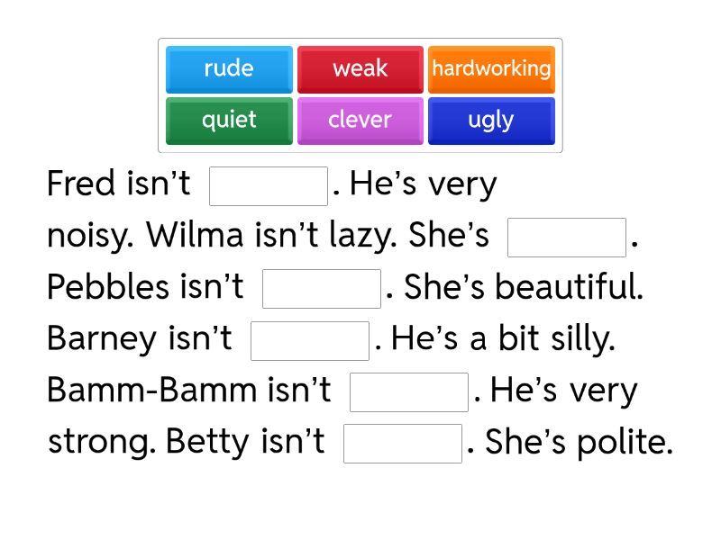 Fred isn’t ____. He’s very noisy. Wilma isn’t lazy. She’s ____. Pebbles isn’t ____. She’s beautiful. Barney isn’t ____. He’s a bit silly. Bamm-Bamm isn’t ____. He’s very strong. Betty isn’t ____. She’s polite.