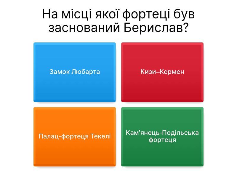 1) На місці якої фортеці був заснований Берислав? a) Замок Любарта b) Кизи–Кермен c) Палац-фортеця Текелі d) Кам'янець-Подільська фортеця 2) На березі якої ріки знаходиться наш Берислав? a) Дністер b) Дунай c) Дніпро d) Інгулець 3) Як виглядає герб Берислава? a) b) c) d) 4) Як перекладається з турської назва фортеці "Кизи–Кермен"? a) фортеця Святих воїнів b) фортеця Пса патрона c) фортеця Львів d) фортеця війська запорозького 5) На якому фото місто Берислав? a) b) c) d) 6) День міста Берислав: a) 1 неділя вересня b) 2 неділя вересня c) 3 неділя вересня d) 4 неділя вересня 7) Від якої фрази пішла назва нашого міста? a) Бери славу! b) Яке славне місто c) Це місце слави d) Прославляйте місто 8) В який день Берислав звільнили від російської окупації? a) 11 грудня 2022 b) 11 червня 2022 c) 11 листопада 2022 d) 11 жовтня 2022 9) Як дерев'яна церква була переправлена до міста Берислав? a) Возами b) По річці Дніпро флотами c) Чайками d) Її не переправляли 10) Хто в давні часи жив на території сучасної Бериславщини? a) Скіфи b) Плем'я Мая c) Кашибанці d) Вукі 11) Чи є Берислав одним із найдавніших міст Херсонщини? a) Ні b) Так c) Можливо d) Не знаю 12) На пропорі Бериславу зображено... a) Тільки козацький колокол b) Козак c) Козак з кавуном d) Фортеця Кизи-Кермен 13) Поряд з Бериславом є залишки Каменської Січі? a) Ні b) Так c) Не знаю d) Можливо 14) Чий колокол стоїть на березі Дніпра? a) Козацький b) Кашибанців c) Скіфів d) Пса Патрона 15) Ви любите Берислав? a) ЗВІСНО b) ЗВИЧАЙНО c) ТАК d) Всі відповіді вірні e) ні f) ДА