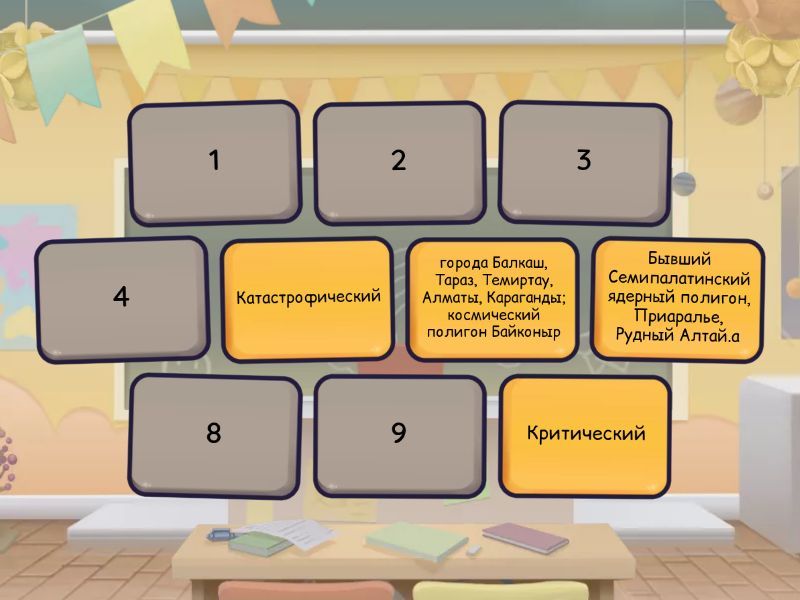 Катастрофический - Бывший Семипалатинский ядерный полигон, Приаралье, Рудный Алтай.а, Критический - города Балкаш, Тараз, Темиртау, Алматы, Караганды; космический полигон Байконыр, Напряженный - Месторождения нефти Эмба, Актюбинск, Карачаганак (газ), Удовлетворительный - Города Кокшетау, Астана, Талдыкорган, Петропавловск,; аквальные комплексы рек Жайык, Сарысу, Тобыл,, Талас, Благоприятный - Малонаселенные территории , пустыни, полупустыни, горные районы,