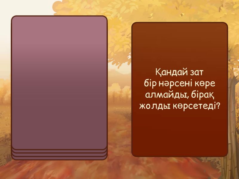 Тізбекті жалғастыр 5,8,11,...,..., Қандай зат бір нәрсені көре алмайды, бірақ жолды көрсетеді?, Допты лақтырғанда, доп сол ізімен кері қайту үшін оны қалай лақтыру керек?, Бір отбасыда 5 ер бала бар және олардың әрқайсысының 1 қарындастары бар.Сұрақ отбасыда қанша бала бар?, Ағаштың үстінде 12 торға отыр,аңшы оның 1еуін атып өлтірді.Ағаштың үстінде қанша торғай қалды?.