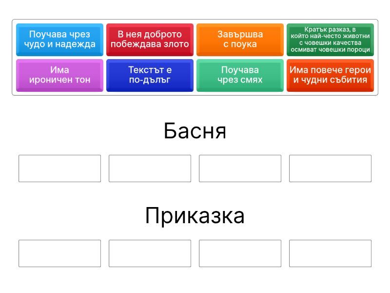 Басня: Кратък разказ, в който най-често животни с човешки качества осмиват човешки пороци, Завършва с поука, Има ироничен тон, Поучава чрез смях, Приказка: Текстът е по-дълъг, Има повече герои и чудни събития, В нея доброто побеждава злото, Поучава чрез чудо и надежда,