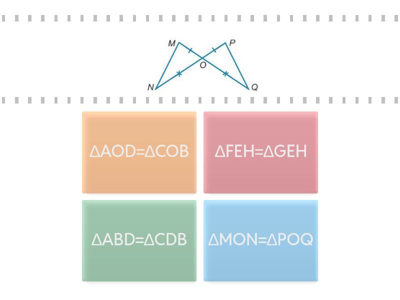 ∆MON=∆POQ, ∆FEH=∆GEH, ∆AOD=∆COB, ∆ABD=∆CDB,