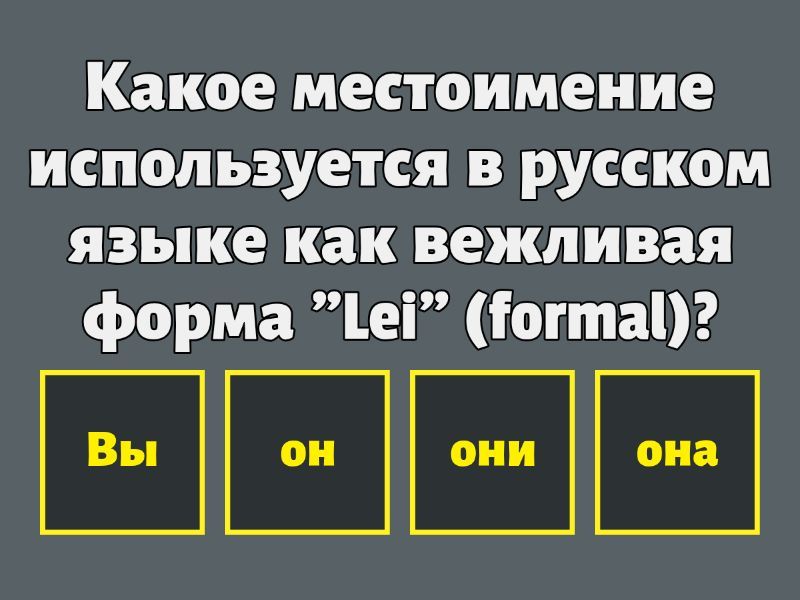 1) Какое местоимение используется в русском языке как вежливая форма "Lei" (formal)? a) Вы b) он c) они d) она 2) Выберите слово, где выделенная буква [Е] произносится как в слове ГДЕ: a) пенсионерка b) энергия c) поэт d) лес 3) Добавьте пропущенное слово: Это Юрий. ... - космонавт. a) она b) ты c) он d) вы 4) Который час? / Сколько времени? - 10.30 a) Десять ноль три. b) Девять тридцать. c) Десять тридцать. d) Девять тринадцать. 5) Какое слово нужно добавить в этот ряд? салат, торт, суп, блины, икра... a) вино b) котлета c) вода d) чай 6) Какого рода слово "кофе"? a) мужского b) женского c) среднего d) и мужского, и среднего 7) Назовите слово, которое отвечает на вопрос КТО? и оканчивается на согласный a) дедушка b) мама c) день d) муж 8) Если полное имя Виктор, как его отчество, если имя отца Владимир? a) Владимировна b) Викторович c) Викторовна d) Владимирович 9) Екатерина - это .... a) Лиза b) Кира c) Катя d) Тина 10) Переведите на русский язык: Lui ha un cane. a) У меня есть собака b) У меня есть кошка. c) У него есть собака. d) У неё есть кошка. 11) Числительное 40 словом: a) четыреста b) сорок c) четырнадцать d) четыре 12) Форма множественного числа для слова ребёнок - .... a) человеки b) ребёнки c) люди d) дети 13) Бегемот значит... a) gatto b) cane c) ippopotamo d) procione 14) Кличка кота в романе Булгакова "Мастер и Маргарита" - ... a) Азазелло b) Бегемот c) Воланд d) Коровьев-Фагот