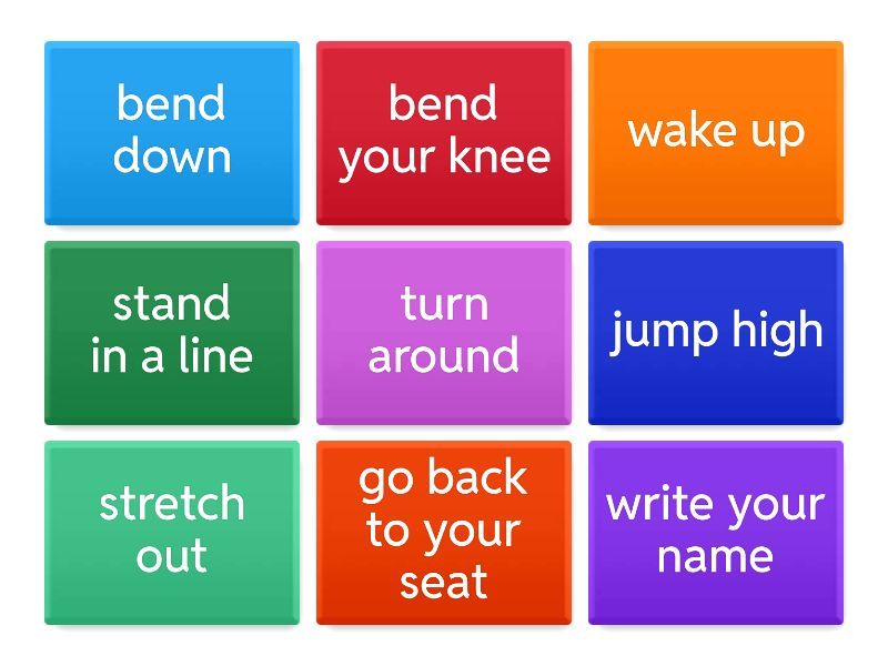 wake up, stretch out, bend down, turn around, jump high, bend your knee, stand in a line, write your name, go back to your seat,