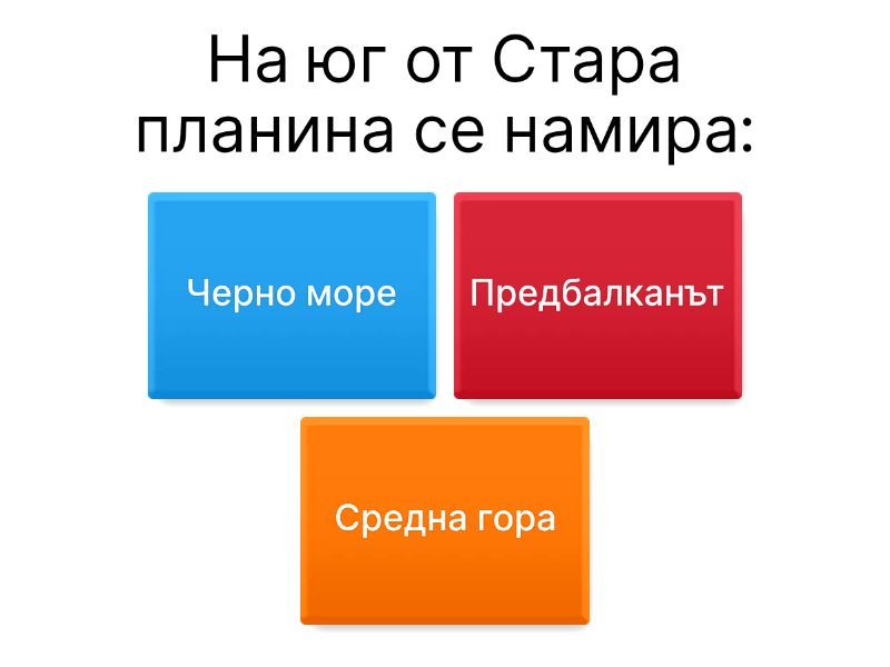1) На юг от Стара планина се намира: a) Черно море b) Предбалканът c) Средна гора 2) В долната част на картата е посоката: a) север b) изток c) юг 3) За коя природна област се отнася описанието? Разположена е в Южна България. Включва различна по големина и височина планински и равнинни земи. a) Дунавската равнина b) Рило-Родопската област c) Преходната област 4) Коя река преминава през Преходната област? a) Тунджа b) Янтра c) Камчия 5) Маслодайната роза се отглежда в: a) Софийското поле b) Казанлъшкото поле c) Горнотракийската низина 6) Кои земеделски растения са характерни само за Горнотракийската низина? a) царевица и картофи b) пшеница и тютюн c) ориз и памук 7) Коя река напоява Горнотракийската низина? a) Искър b) Места c) Марица 8) Какви полезни изкопаеми има в Горнотракийската низина? a) каменна сол b) въглища c) нефт 9) В коя планина хората се занимават с добив и преработка на медна руда? a) Предбалкана b) Средна гора c) Рила 10) Коя природна област е богата на минерални извори? a) Дунавската равнина b) Черноморското крайбрежие c) Преходната област 11) Отглеждането на лозя и винопроизводство са характерни за: a) Горнотракийската низина b) Стара планина c) Софийското поле 12) В коя част на България се намира град София? a) източната b) западната c) северната 13) В кой български град в началото на ХІХ в. е открито първото фабрично предприятие? a) Сливен b) Габрово c) София 14) Кои градове се намират в Задбалканските полета? a) Карлово, Калофер b) Стара Загора, Перник c) Пловдив, Хасково 15) Кой град е известен балнеолечебен курорт? a) Пловдив b) Хисаря c) Казанлък 16) Трудовата дейност на хората е свързана с пасищно животновъдство и дърводобив в: a) Софийското поле b) Средна гора c) Горнотракийската низина 17) Допълни правилно изречението. В ___________________ се отглеждат памук, ориз, зеленчуци и овощни дръвчета. a) Дунавската равнина b) Горнотракийска низина c) Предбалкана 18) Довърши пропусната посока в изречението. Град Пловдив се намира на _______________ от Средна гора. a) изток b) запад c) юг