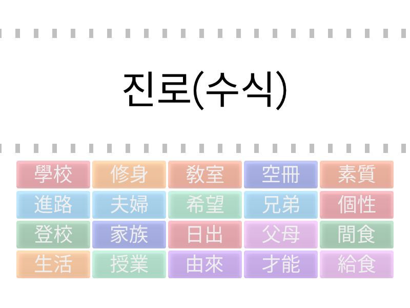 進路 - 진로(수식), 日出 - 일출(주술), 修身 - 수신(술목), 登校 - 등교(술보), 父母 - 부모(병렬), 家族 - 가족, 希望 - 희망, 素質 - 소질, 才能 - 재능, 夫婦 - 부부, 個性 - 개성, 生活 - 생활, 間食 - 간식, 給食 - 급식, 空冊 - 공책, 授業 - 수업, 敎室 - 교실, 由來 - 유래, 兄弟 - 형제, 學校 - 학교,