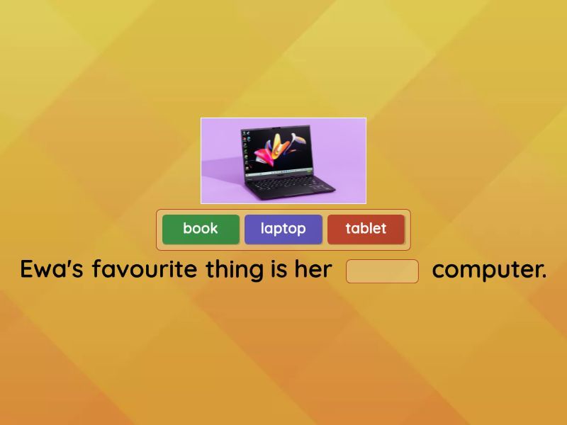 Ewa's favourite thing is her ____ computer. Jack's favourite thing is his ____ . Marco’s favourite thing is his ____ Lucy’s favourite thing is her ____ Theo’s favourite thing is his ____ Gina’s favourite thing is her ____