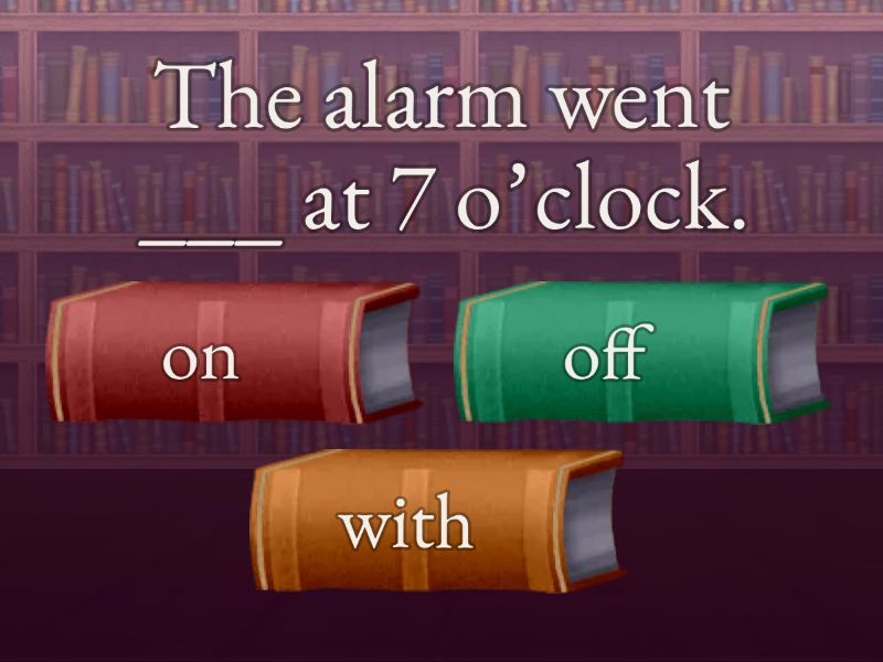 1) The alarm went ___ at 7 o’clock. a) on b) off c) with 2) This T-shirt goes ___ your jeans. a) on b) off c) with 3) Please, go ___ reading the text. a) on b) off c) with 4) The yoghurt went ___ yesterday. a) on b) off c) with 5) The fireworks went ___ loudly. a) on b) off c) with 6) Go ___ and finish the exercise. a) on b) off c) with 7) These colours don’t go ___ each other. a) on b) off c) with 8) The party went ___ until midnight. a) on b) off c) with