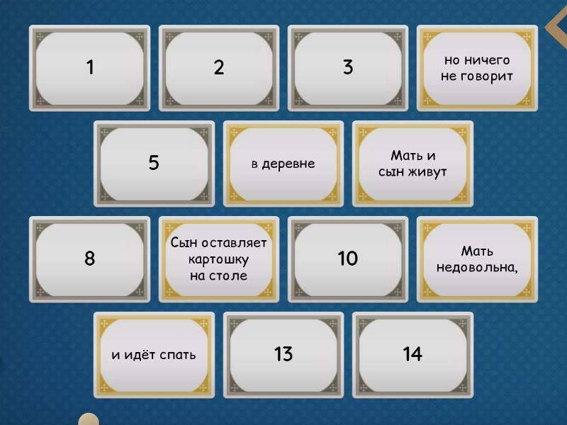 Мать и сын живут - в деревне, Сын оставляет картошку на столе - и идёт спать, Мать недовольна, - но ничего не говорит, Утром мать будит - сына очень рано, Сегодня мы будем - работать вместе, Корова даёт - вкусное молоко, Он любит спать долго - и всегда встаёт поздно,