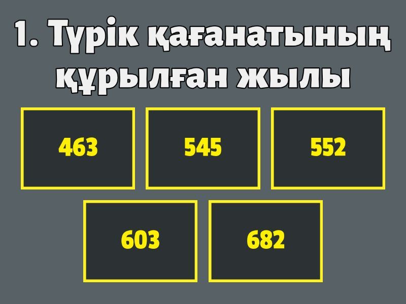 1) 1. Түрік қағанатының құрылған жылы a) 463 b) 545 c) 552 d) 603 e) 682 2) Түрік қағанатын құрған қаған a) Тон қаған b) Атилла c) Естеми d) Бумын қаған e) Елтеріс 3) Батыс Түрік қағанатының орталығы a) Суяб b) Мыңбұлақ c) Баласағұн d) Яссы e) Тараз 4) Түргеш қағанатының негізін қалаушы a) Шегу b) Білге c) Құтлық d) Елтеріс e) Үшлік қаған 5) 5. Қарлұқ қағанатының астанасы a) Қарақорым b) Баласағұн c) Суяб d) Сығанақ e) Испиджаб 6) Оғыз мемлекетінің орталығы a) Ясы b) Тараз c) Янгикент d) Баласғұн e) Отырар 7) Қимақ қағанатының тайпалық бірлестігіне кірген тайпа a) Қыпшақ b) Оғыз c) Ертіс қимақтары d) Қаңлы e) Найман 8) Қарахан мемлекетіндегі негізгі дін a) Тәңіршілдік b) Зороастризм c) Буддизм d) Ислам e) Христиандық 9) Қыпшақ мемлекетінің негізгі этносын құраған тайпа a) Оғыз b) Қанлы c) Қыпшақ d) Арғын e) Қимақ 10) 603 жылы Түрік қағанаты неге бөлінді? a) Табиғи апаттан b) Сыртқы жауға байланысты c) Ішкі тартыстарға байланысты d) Экономикалық дағдарыстан e) Қытайдың басқыншылығынан 11) Батыс Түрік қағанатындағы негізгі тайпа? a) Қыпшақ b) Дулат c) Найман d) Арғын e) Қоңырат 12) Шығыс Түрік қағанатын қайта күшейткен қаған? a) Естеми b) Қара-Еске c) Білге қаған d) Ашиналар e) Жегүй 13) Қарахан мемлекеті исламды мемлекеттік дін ретінде қабылдаған жыл: a) 751 b) 841 c) 960 d) 1041 e) 999 14) Қарақытай мемлекеті қай жылы құрылды? a) 958 b) 942 c) 1050 d) 720 e) 552 15) Қыпшақ хандығының екіге бөлінген кезеңі: a) ХІІ ғасыр b) Х ғасыр c) ХІ ғасыр d) ІХ ғасыр e) ХІІІ ғасыр 16) Қыпшақ хандығының батыс бөлігінің орталығы: a) Сарайшық b) Торғай c) Сарай-Бату d) Сығанақ e) Орда-Базар 17) Оғыздардың билеушісі қалай аталды? a) Хан b) Қаған c) Жабғу d) Малик e) Шад 18) Түргештердің ең күшті кезеңіндегі қаған: a) Үшлік b) Естеми c) Сұлу d) Жегуй e) Қара-Еске 19) Арабтармен шайқаста қытайларды тоқтатқан Түргеш аймағы: a) Жетісу b) Талас c) Сыр бойы d) Ертіс e) Маңғыстау 20) Қимақ қағанатының астанасы: a) Сарайшық b) Қарақоқым c) Сығанақ d) Баласағұн e) Қимақия 21) Қыпшақтардың негізгі қарсыласы: a) Наймандар b) Қарахандықтар c) Қарақытайлар d) Оғыздар e) Русь князьдері 22) Қыпшақтар туралы мәлімет қалдырған араб ғалымы a) Геродот b) Птолемий c) Әл-Фараби d) Әл-Бурини e) Ибн-әл-Асир 23) Қарахан мемлекетіндегі алғашқы құлдырау кезеңі a) Моңғол шапқыншылығынан b) Найман шабуылынан c) Қыпшақтардан d) Шығыс пен Батысқа бөлінуінен e) Қытайдан 24) Оғыз мемлекетінің әлсіреу себебі a) Жер жетіспеушілігі b) Ауыр салық c) Билікке талас d) Шапқыншылық e) Ауа-райының өзгеруі 25) Ерте орта ғасырларда Қытай деректерінде «теле» деп кімдер аталды? a) Қалаларда отырған соғдылар b) Түрік тілдес тайпалар тобы c) От шаруашылықпен айналысқан тайпа d) Парсы тілдес халықтар e) Ұйғырлардың ьір бөлігі