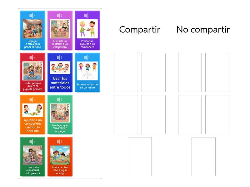 Compartir : Prestar un juguete a un compañero, Invitar a otro niño a jugar conmigo, Esperar mi turno en un juego, Usar los materiales entre todos, Ayudar a un compañero cuando lo necesita, No compartir: Gritar porque quiero el juguete primero, Quitarle un material a un compañero, No dejar que otros entren al juego, Usar todo el material solo para mí, Empujar a otros para ganar el turno,