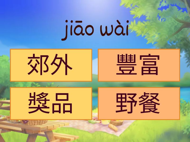 1) jiāo wài a) 郊外 b) 豐富 c) 獎品 d) 野餐 2) jǐng sè a) 景色 b) 郊外 c) 集體 d) 獎品 3) shān qīng shuǐ xiù a) 獎品豐富 b) 山清水秀 c) 集體遊戲 d) 天氣真好 4) yě cān qū a) 景色美 b) 野餐區 c) 照相機 d) 真漂亮 5) jí tǐ yóu xì a) 山清水秀 b) 景色多美 c) 集體遊戲 d) 獎品豐富 6) fēng fù a) 豐富 b) 郊外 c) 景色 d) 遊戲 7) jiǎng pǐn a) 野餐 b) 豐富 c) 郊外 d) 獎品