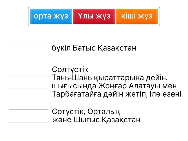 Ұлы жүз - Солтүстік Тянь-Шань қыраттарына дейін, шығысында Жоңғар Алатауы мен Тарбағатайға дейін жетіп, Іле өзені, орта жүз - Сотүстік, Орталық және Шығыс Қазақстан, кіші жүз - бүкіл Батыс Қазақстан,