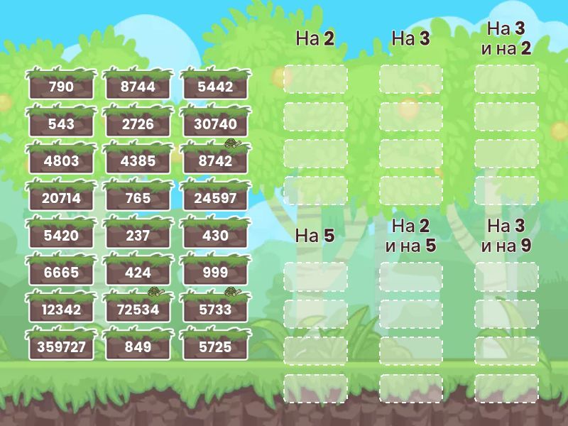 На 2: 424, 2726, 20714, 8744, На 3: 849, 4803, 237, 543, На 3 и на 2: 8742, 5442, 12342, 72534, На 5: 765, 6665, 4385, 5725, На 2 и на 5: 430, 5420, 790, 30740, На 3 и на 9: 999, 5733, 359727, 24597,