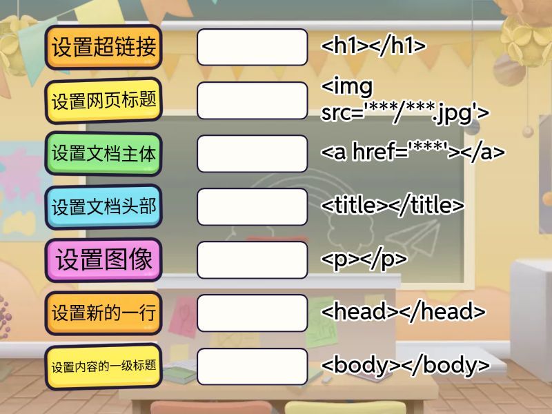 设置网页标题 - <title></title>, 设置内容的一级标题 - <h1></h1>, 设置图像 - <img src='***/***.jpg'>, 设置新的一行 - <p></p>, 设置文档主体 - <body></body>, 设置超链接 - <a href='***'></a>, 设置文档头部 - <head></head>,