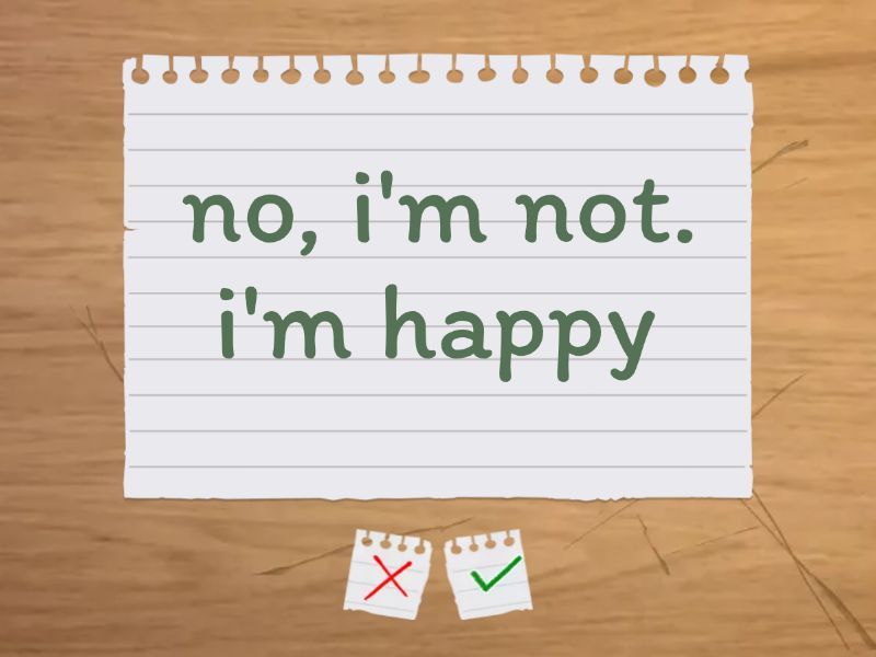 are you ready - Are you ready?, yes, I am - Yes, I am., no, I'm not. i'm hot - No, I'm not. I'm hot., are you hot - Are you hot?, yes, i am - Yes, I am., i'm not hot. i'm hungry - I'm not hot. I'm hungry., are you tired - Are you tired? , no, i'm not. i'm happy - No, I'm not. I'm happy., help! i'm scared - Help! I'm scared.,